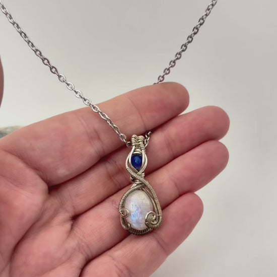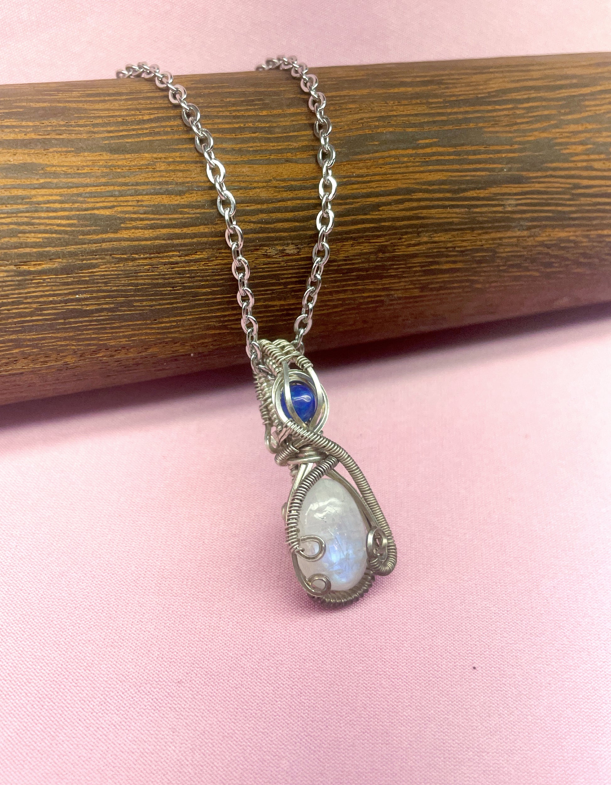 Wire Wrapped Moonstone Gemstone with Opal Accent Necklace, Sterling Silver Wire