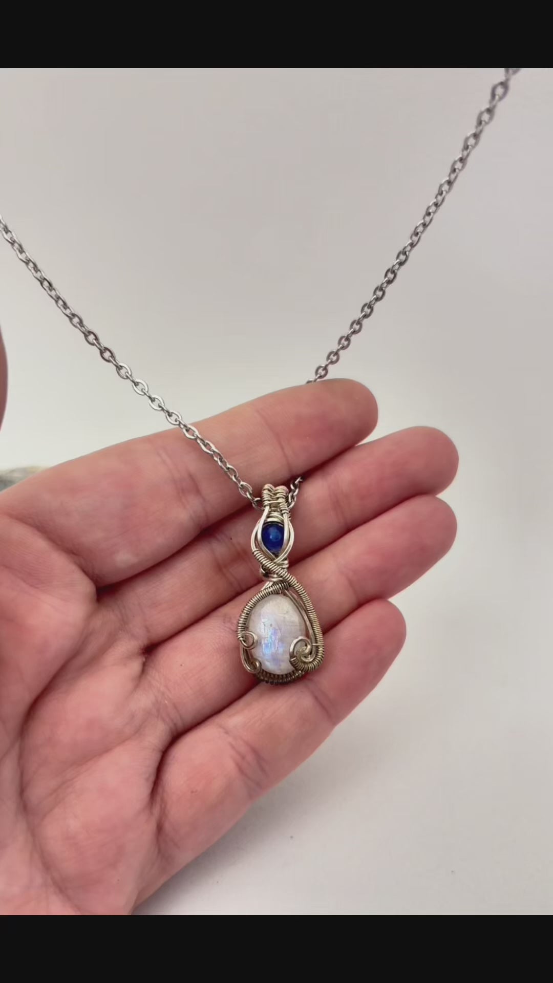 Skillfully crafted with sterling silver wire, this necklace features a mesmerizing moonstone gemstone with a stunning opal accent.