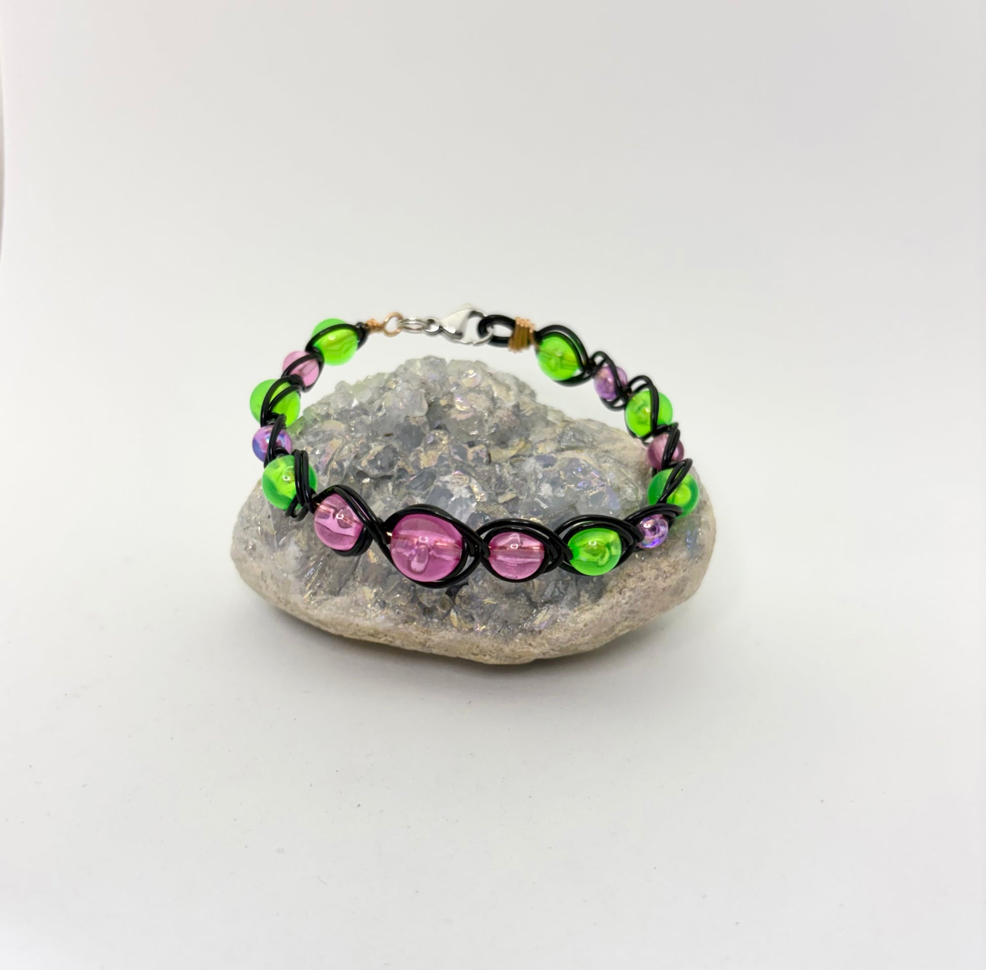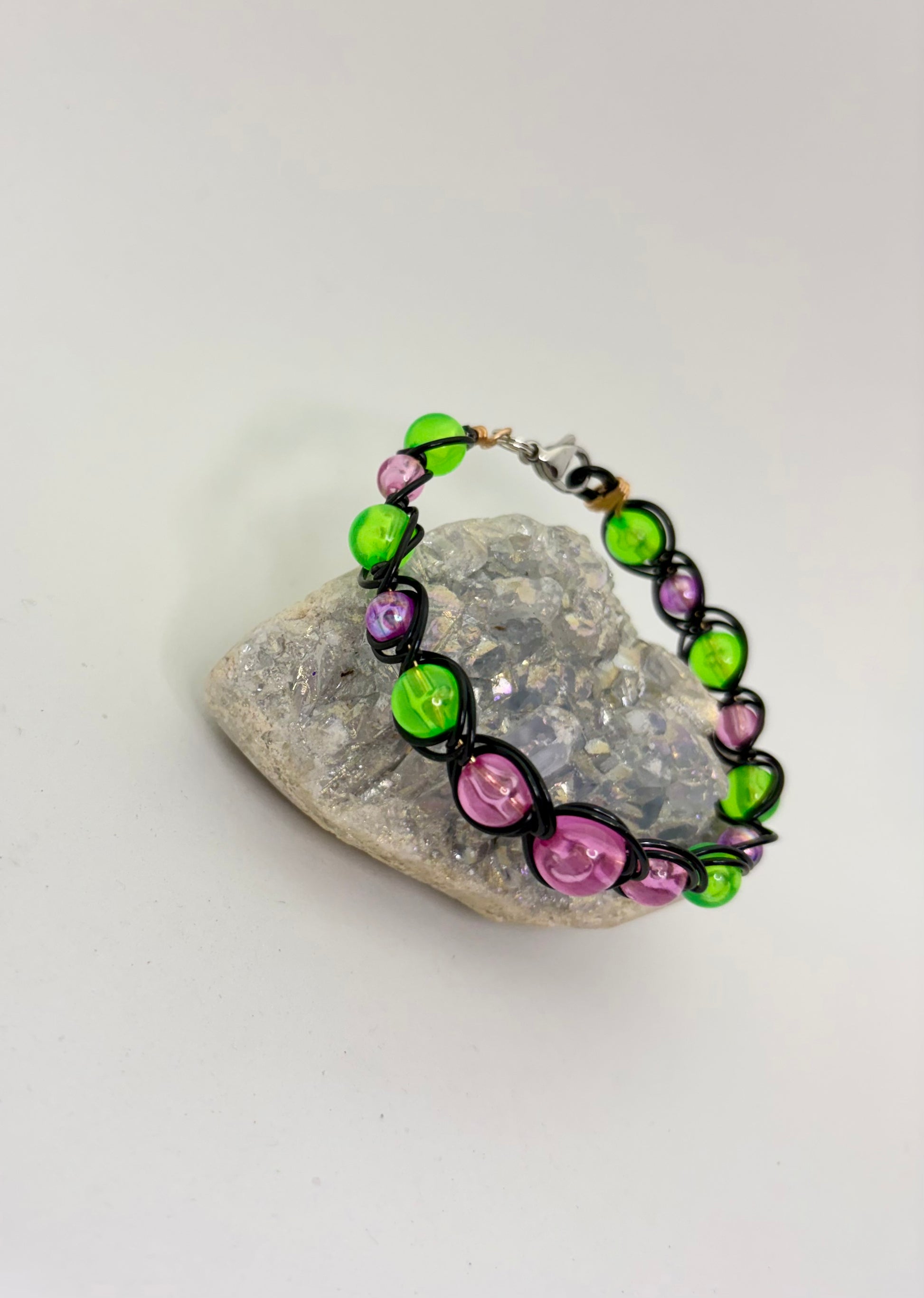 Bright pink and green glass beads twist through glossy black wire by hand, creating a look that’s equal parts fairy garden and electric nightlife. And when the lights go out? The beads softly glow, like captured fireflies dancing around your wrist.