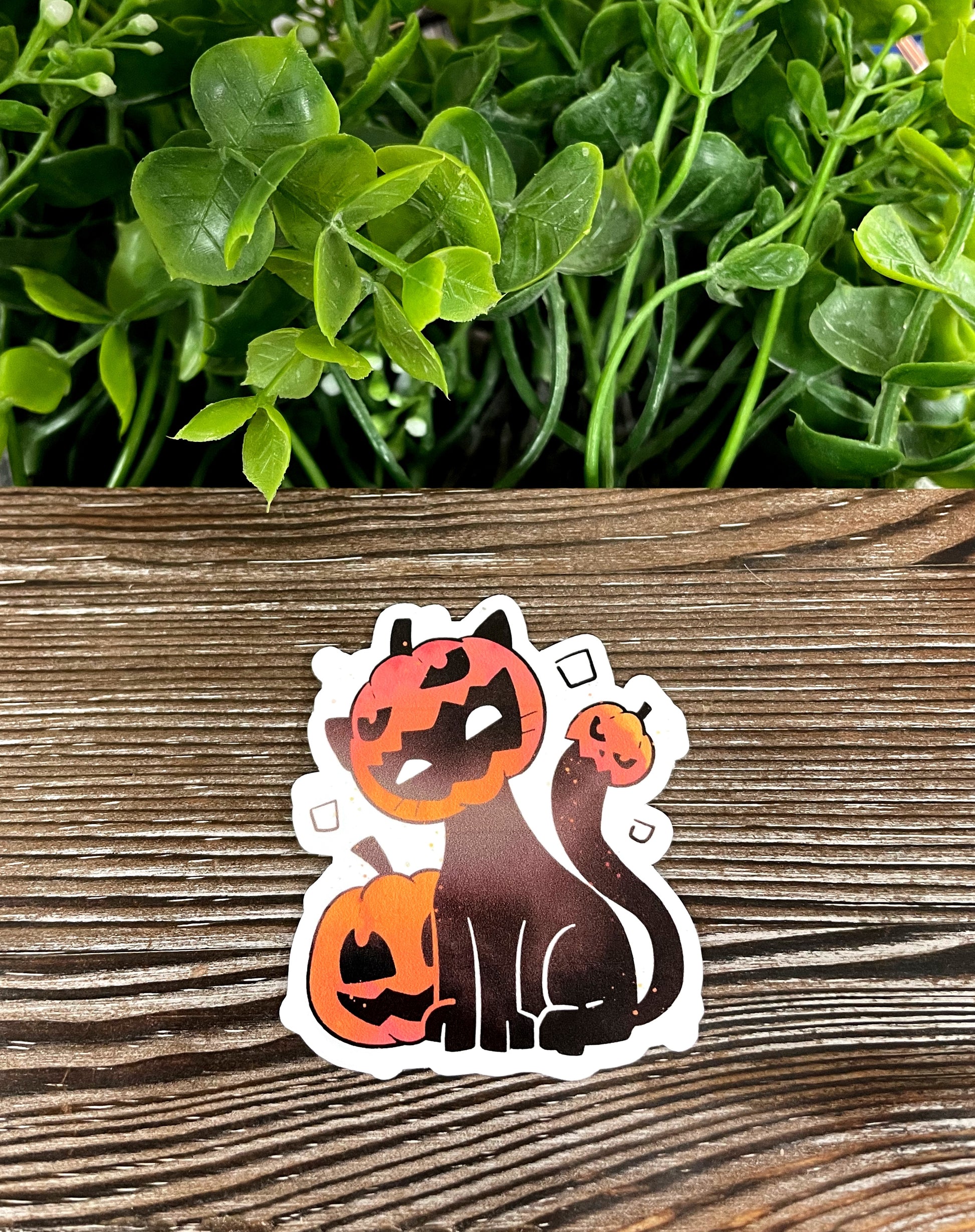 Halloween Black Kitty Wearing a Pumpkin, Die Cut Vinyl Sticker, Boho Fun, Water Resistant, Spooky |Sticker or Magnet