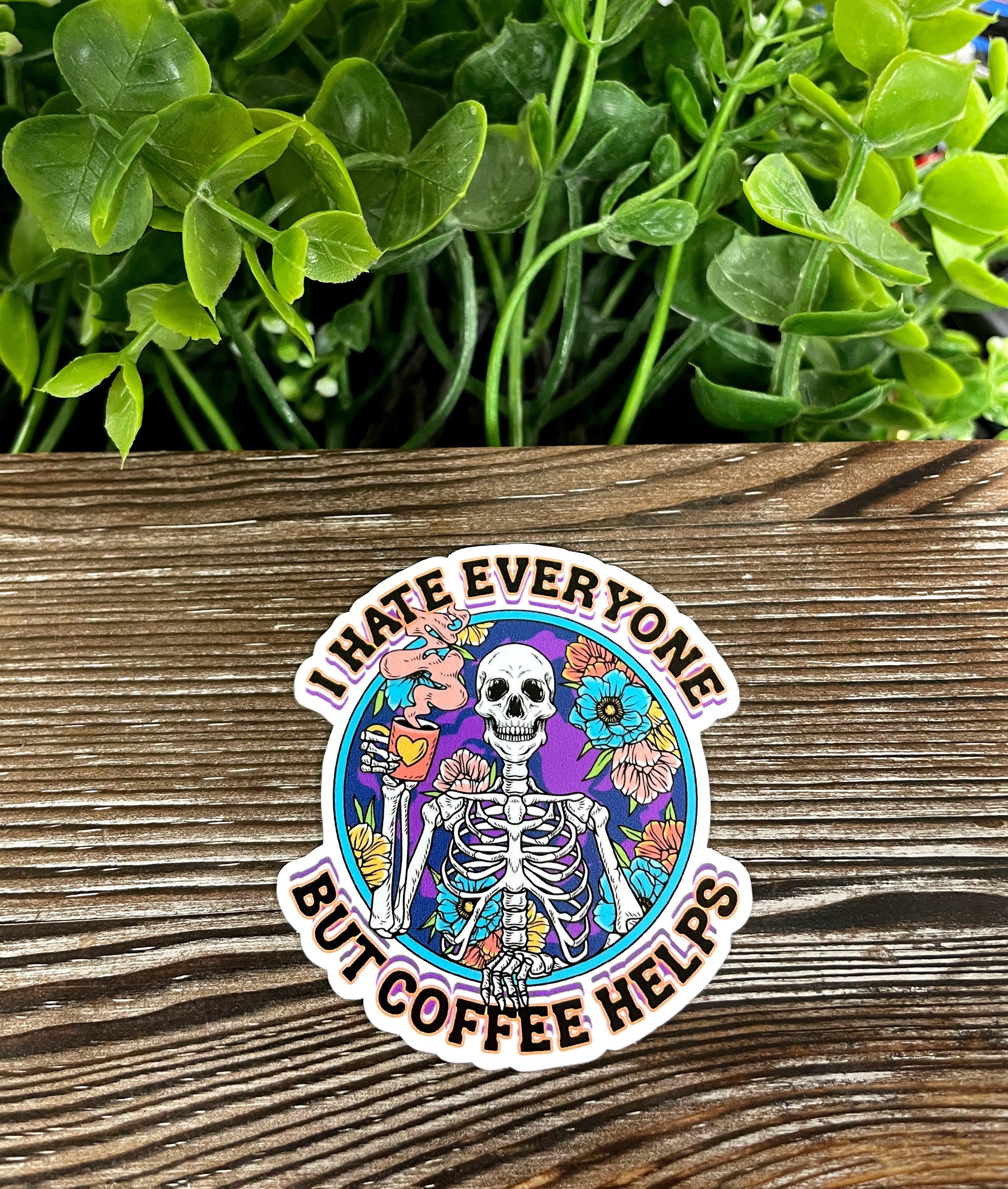 I Hate Everyone but Coffee Helps, Die Cut Vinyl Sticker, Boho Fun, Water Resistant, Snarky Sarcasm Witty Quote, Funny Saying, Skeleton and Flowers |Sticker or Magnet