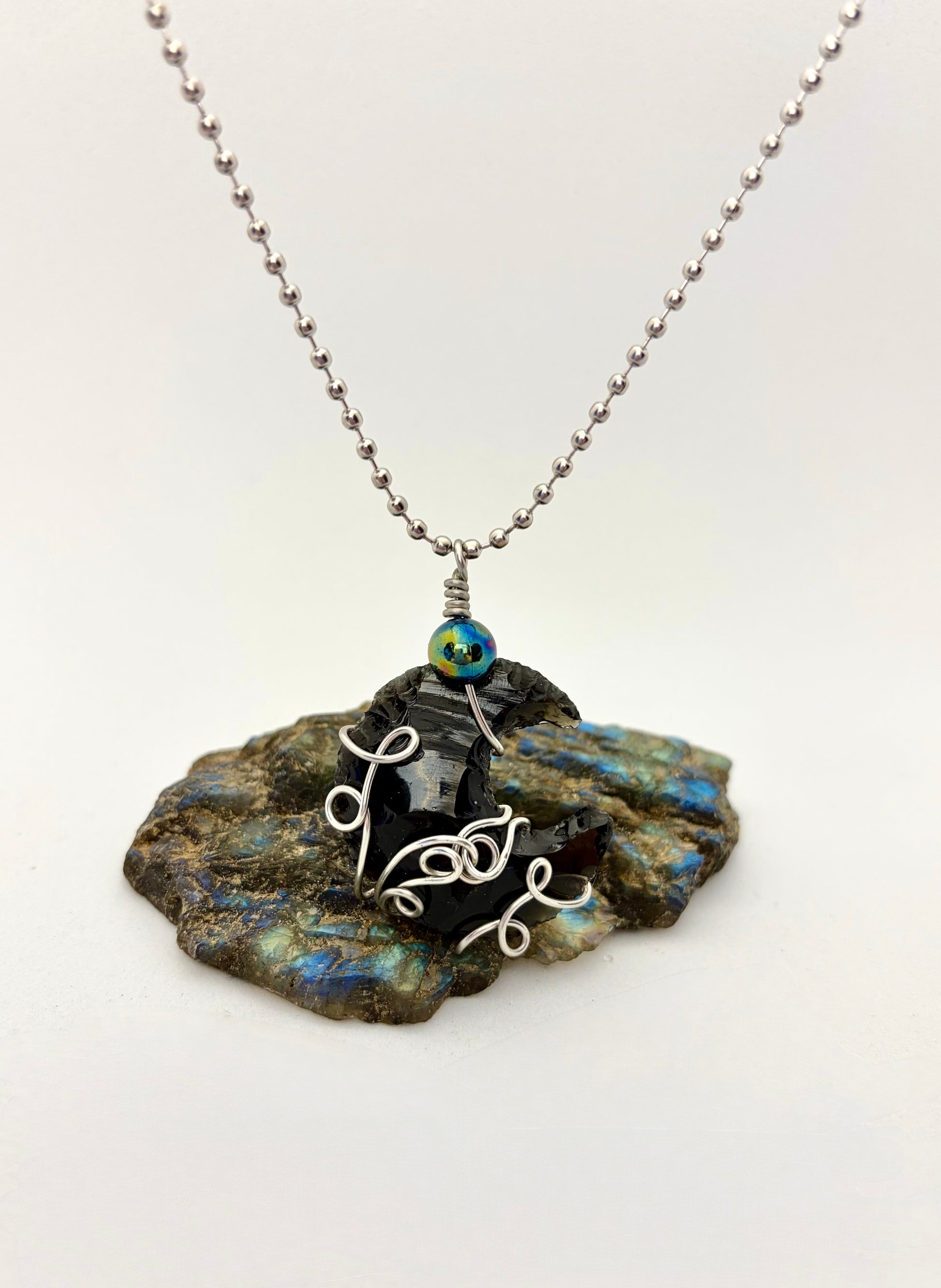 Dark Moon Rising – Stainless Steel Wire Wrapped Obsidian Crescent Necklace