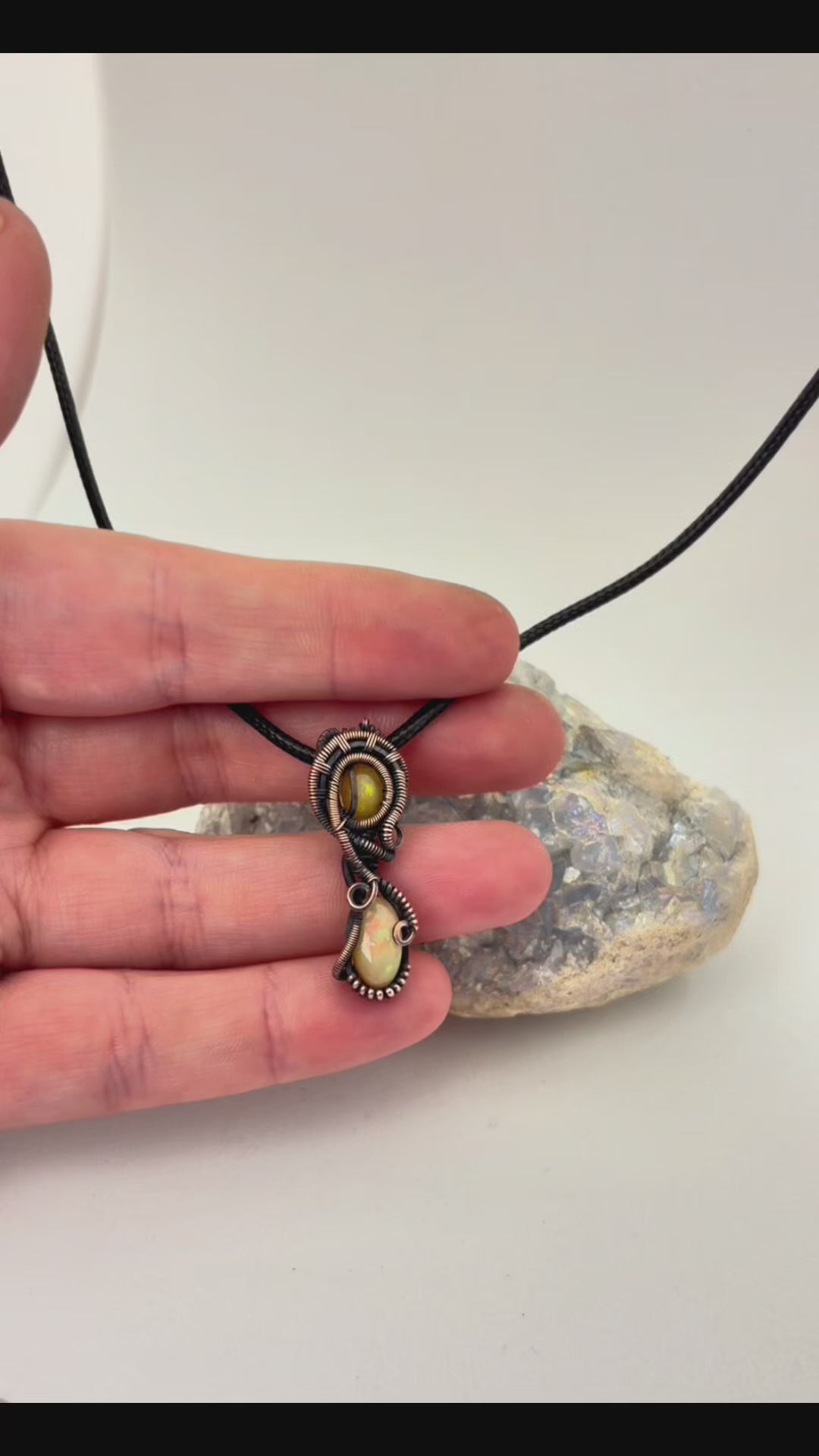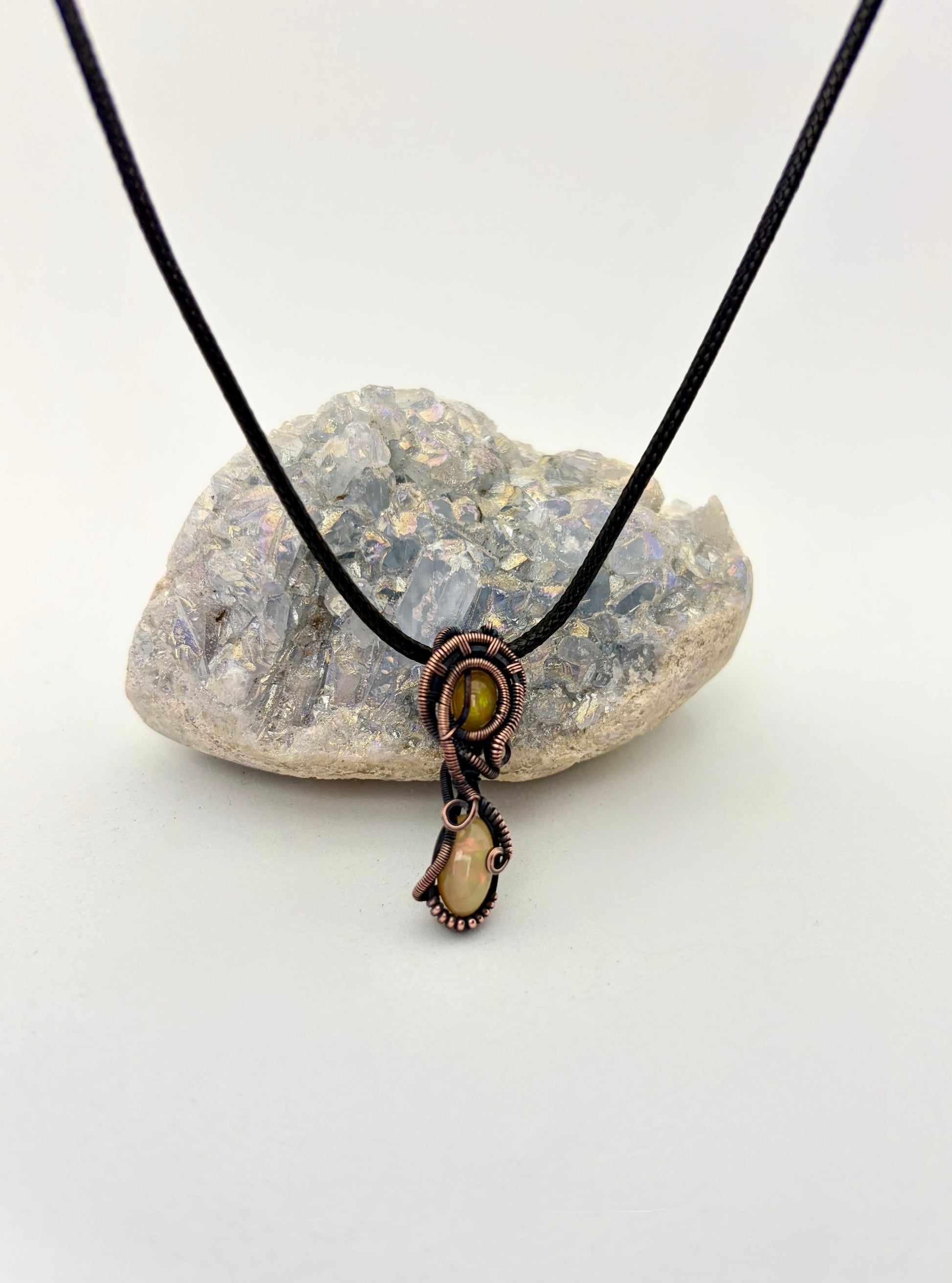 This pendant couldn’t decide which opal to show off… so it went with both. Wrapped in warm copper wire that twists and loops like it had too much coffee, this one-of-a-kind necklace is equal parts chaos and charm.