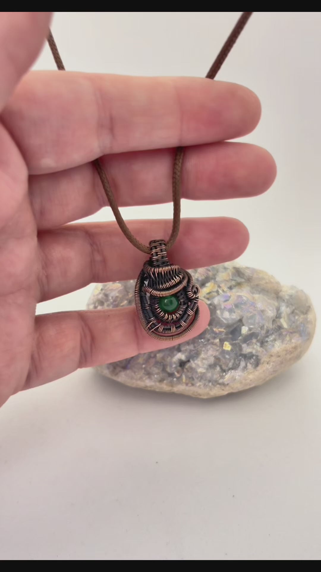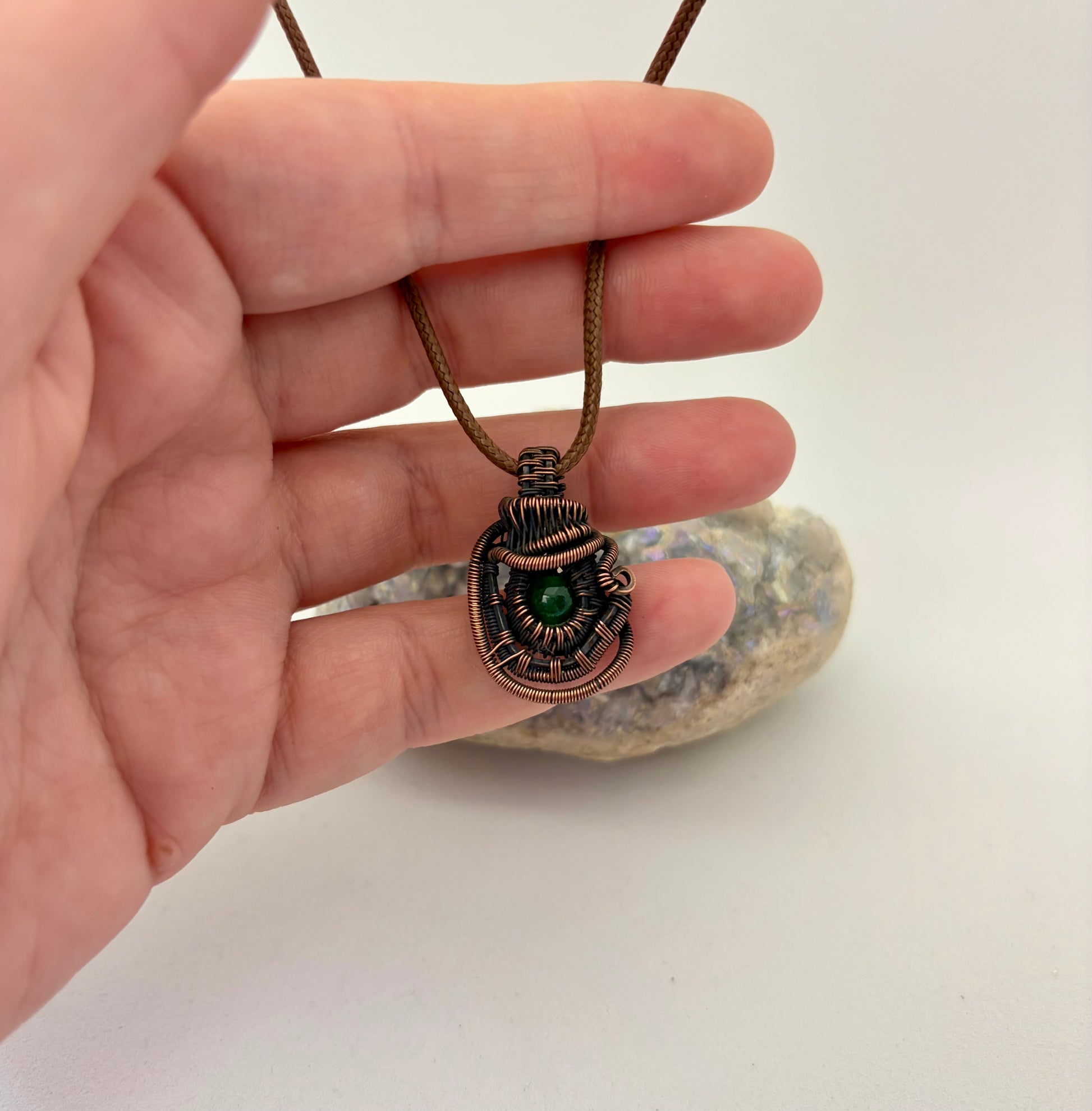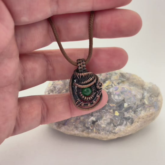 Straight from the forest floor (with extra sparkle), this pendant is all about grounded whimsy. A rich green agate bead rests at the center of an intricate copper wire wrap, full of detailed coils, twists, and texture that only happens when an artist goes “just one more loop” too many.