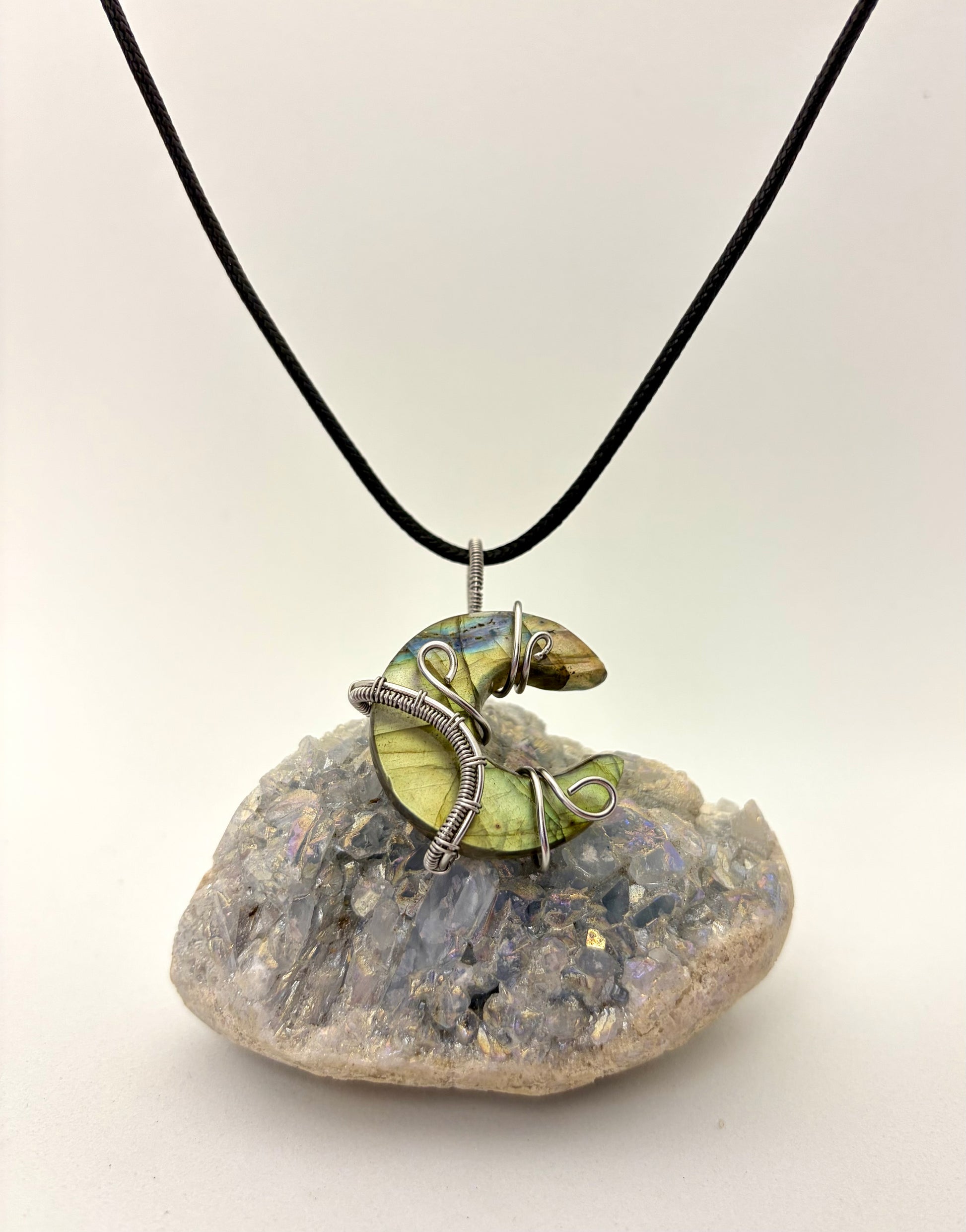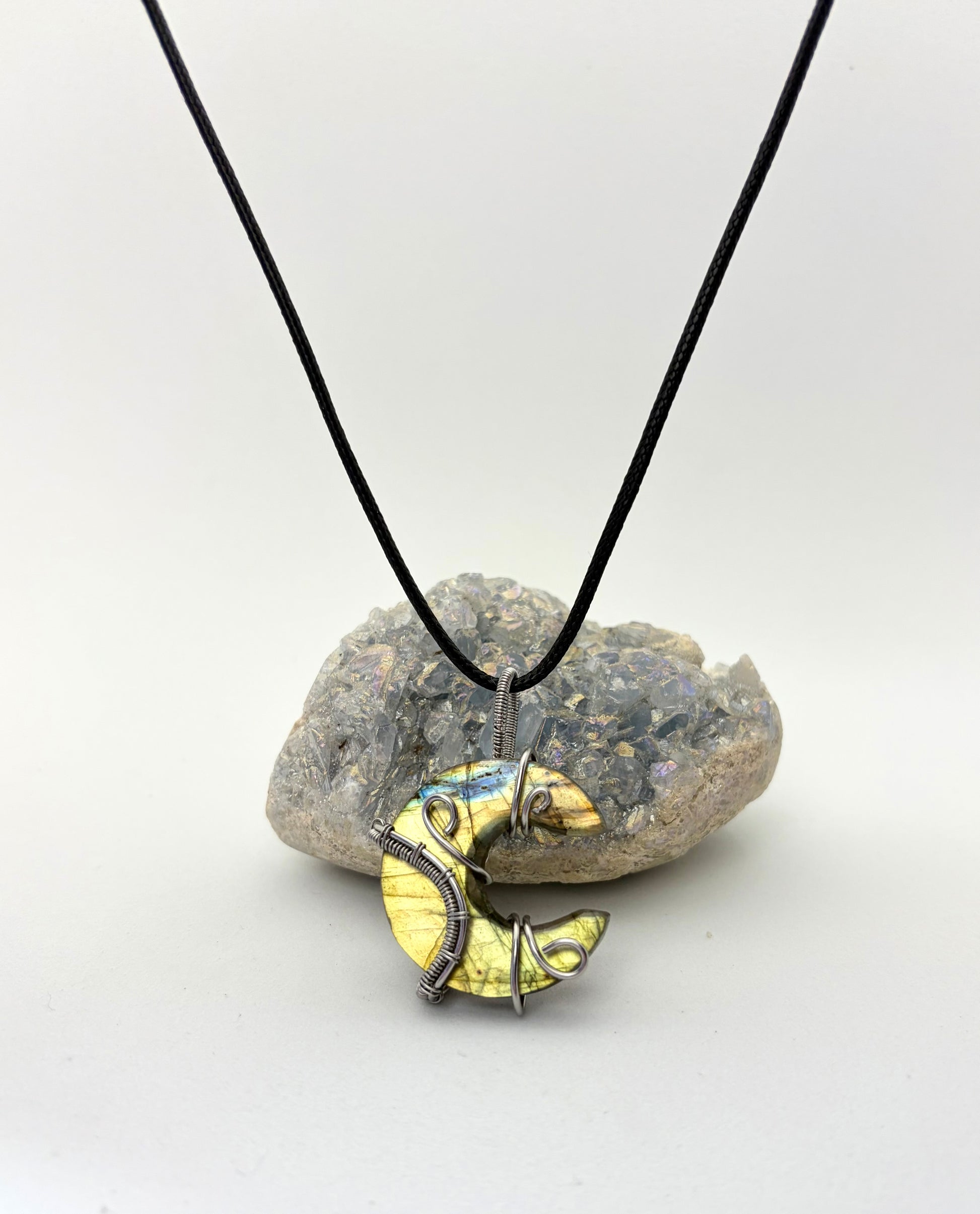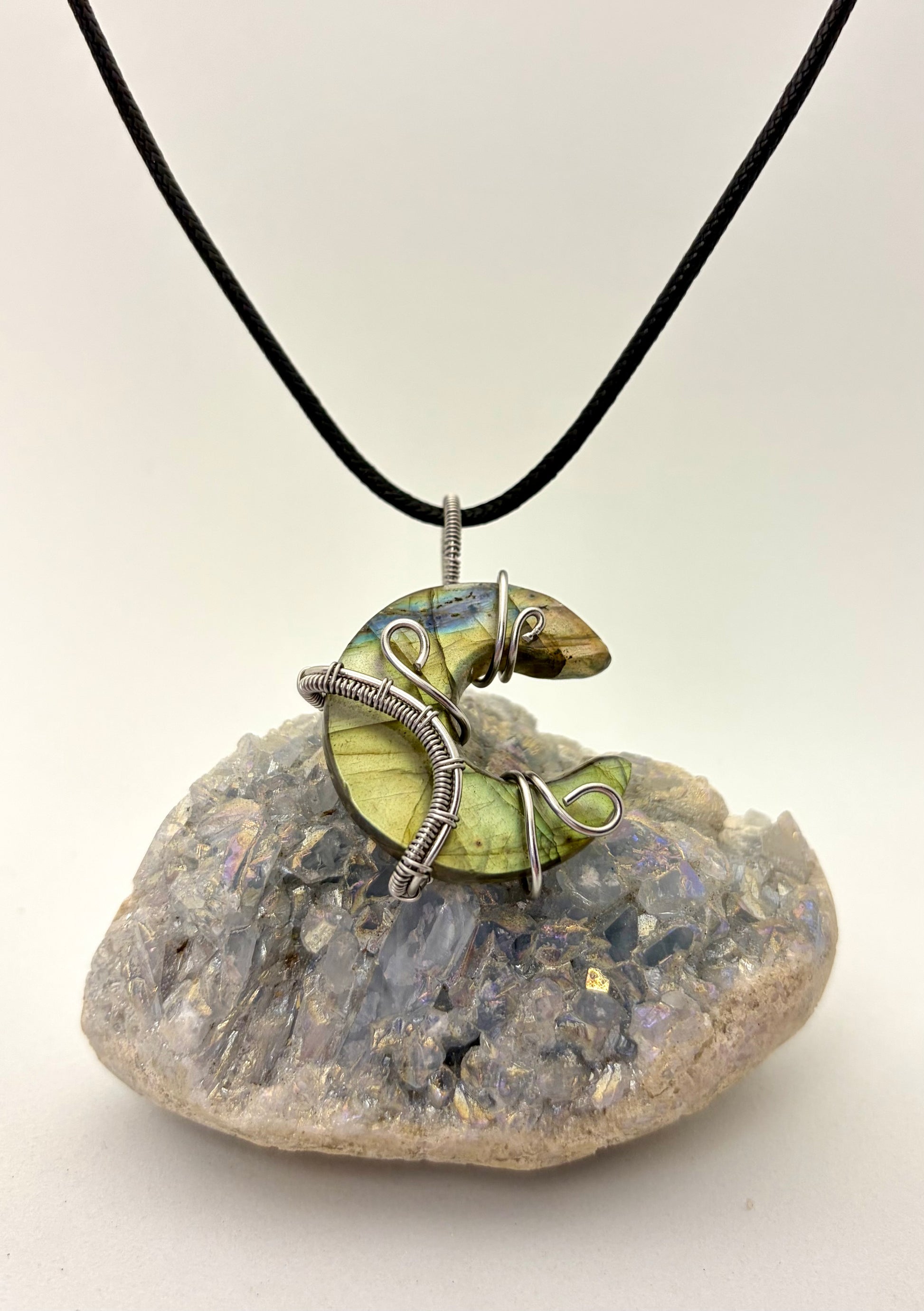 A glowing labradorite crescent moon wrapped in stainless steel wire — full of light, color, and lunar energy. Each twist of wire is shaped by hand, creating a one-of-a-kind wearable artwork.