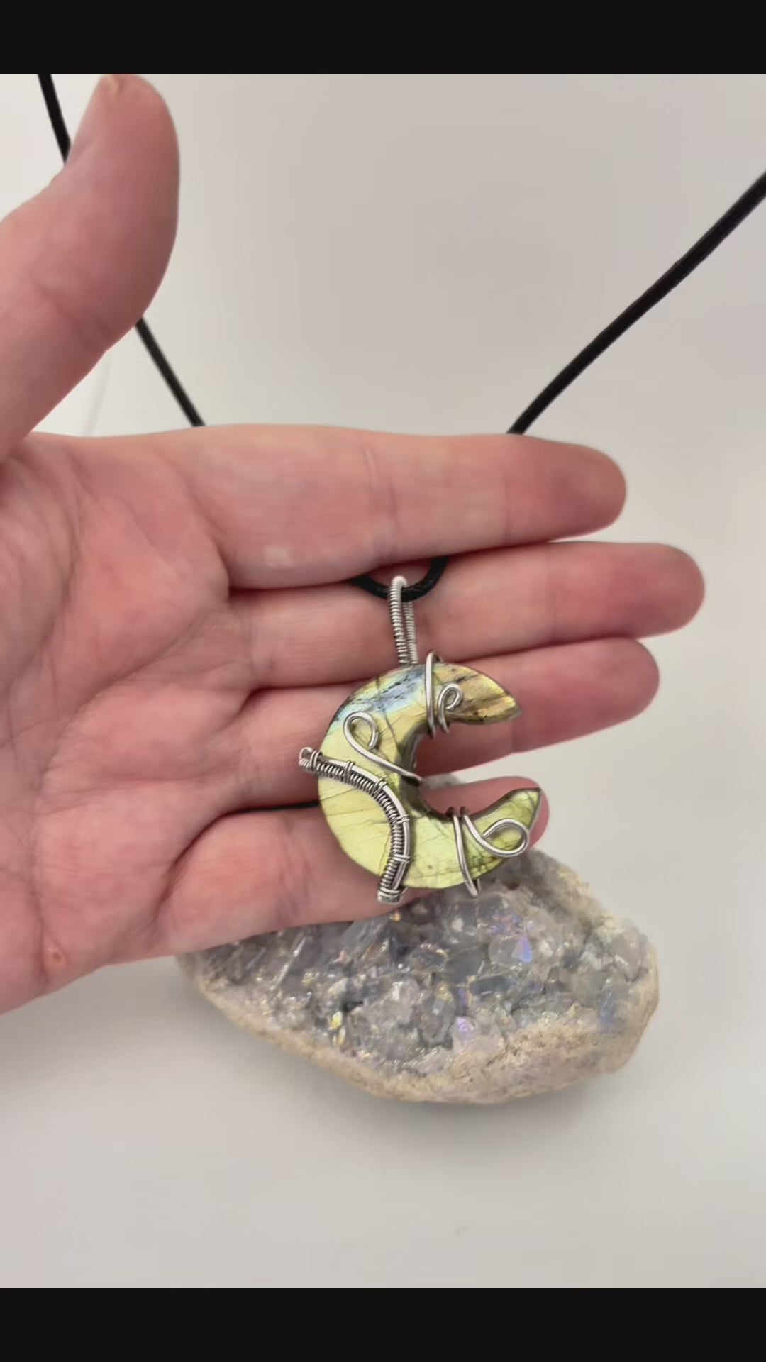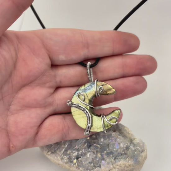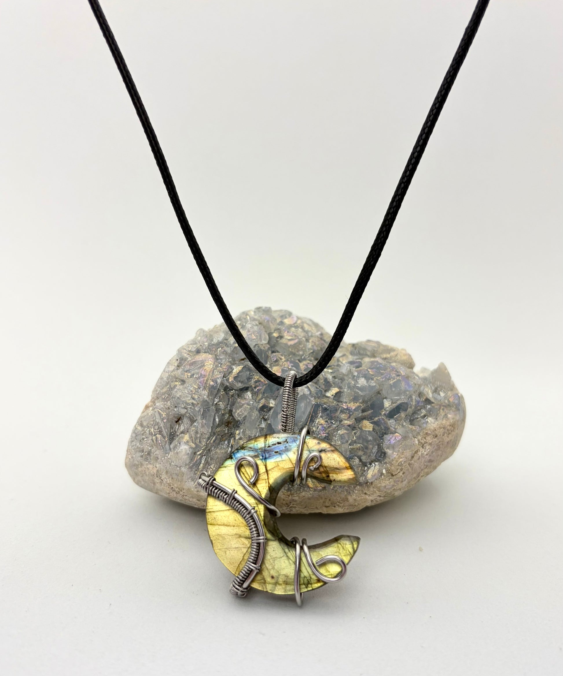 A glowing labradorite crescent moon wrapped in stainless steel wire — full of light, color, and lunar energy. Each twist of wire is shaped by hand, creating a one-of-a-kind wearable artwork.