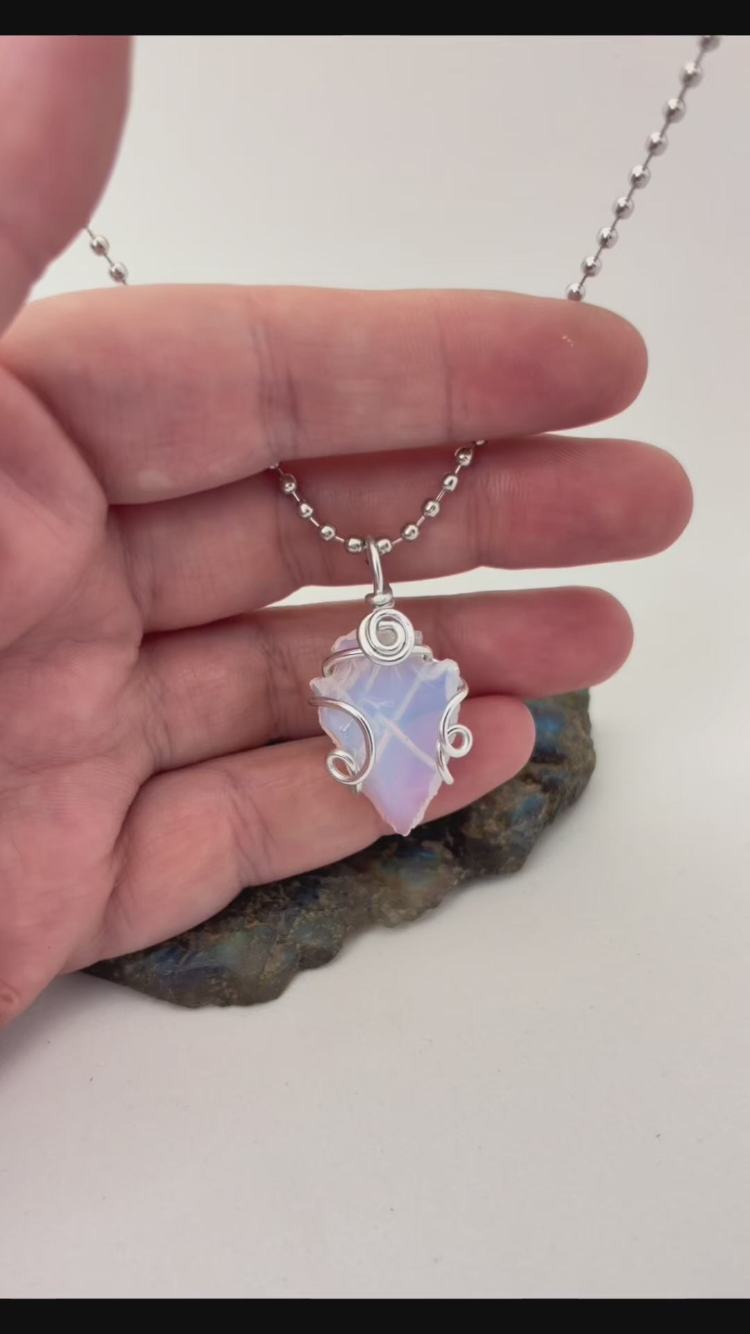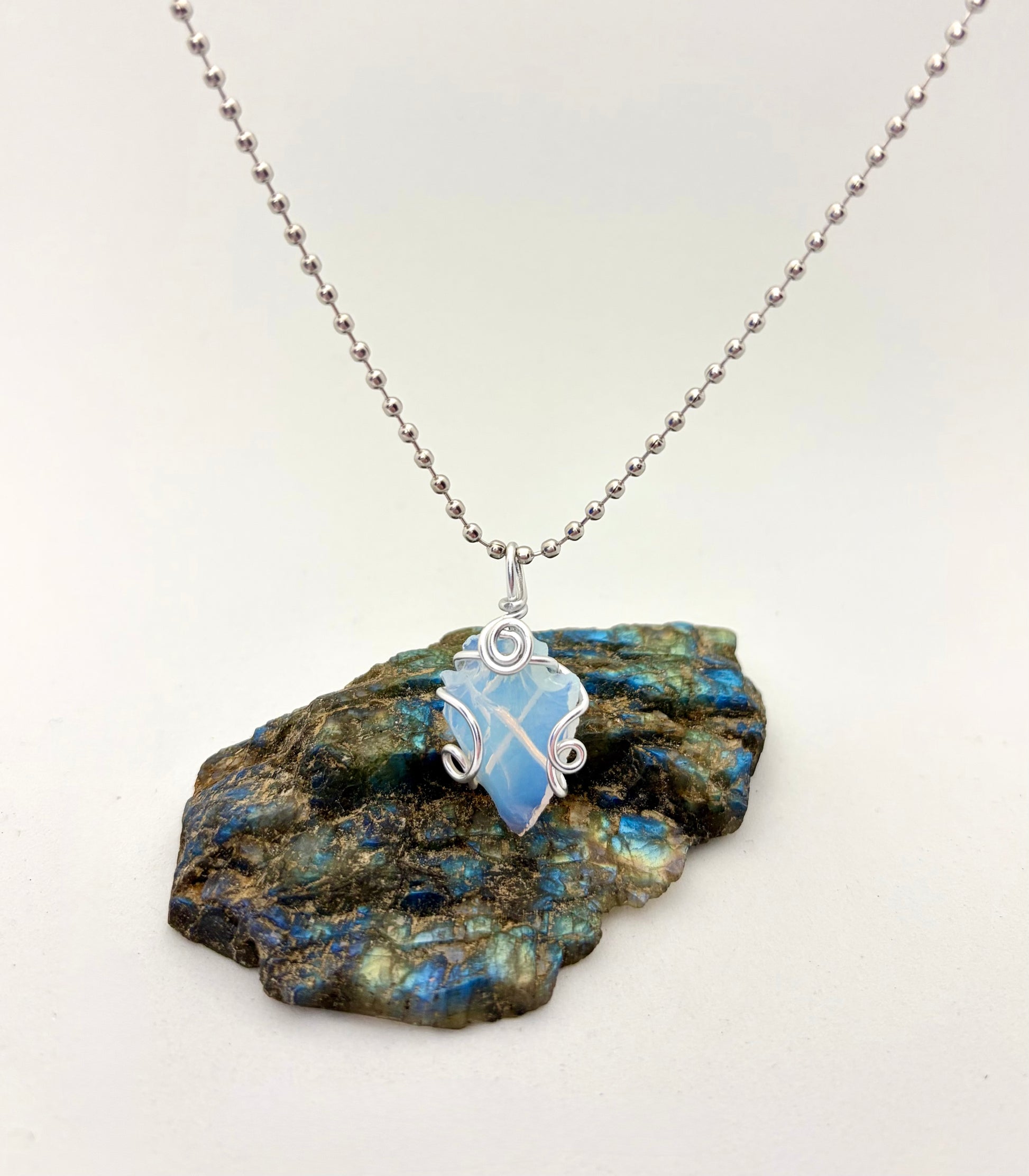 This pendant is what happens when moonlight grows a backbone. A glowing opalite arrowhead shimmers with pastel blues and purples, wrapped in silver aluminum wire that never tarnishes (because this piece was built to shine forever). Each twist of wire is done by hand — no machines, no mass production, just creative chaos and a love for shiny things.