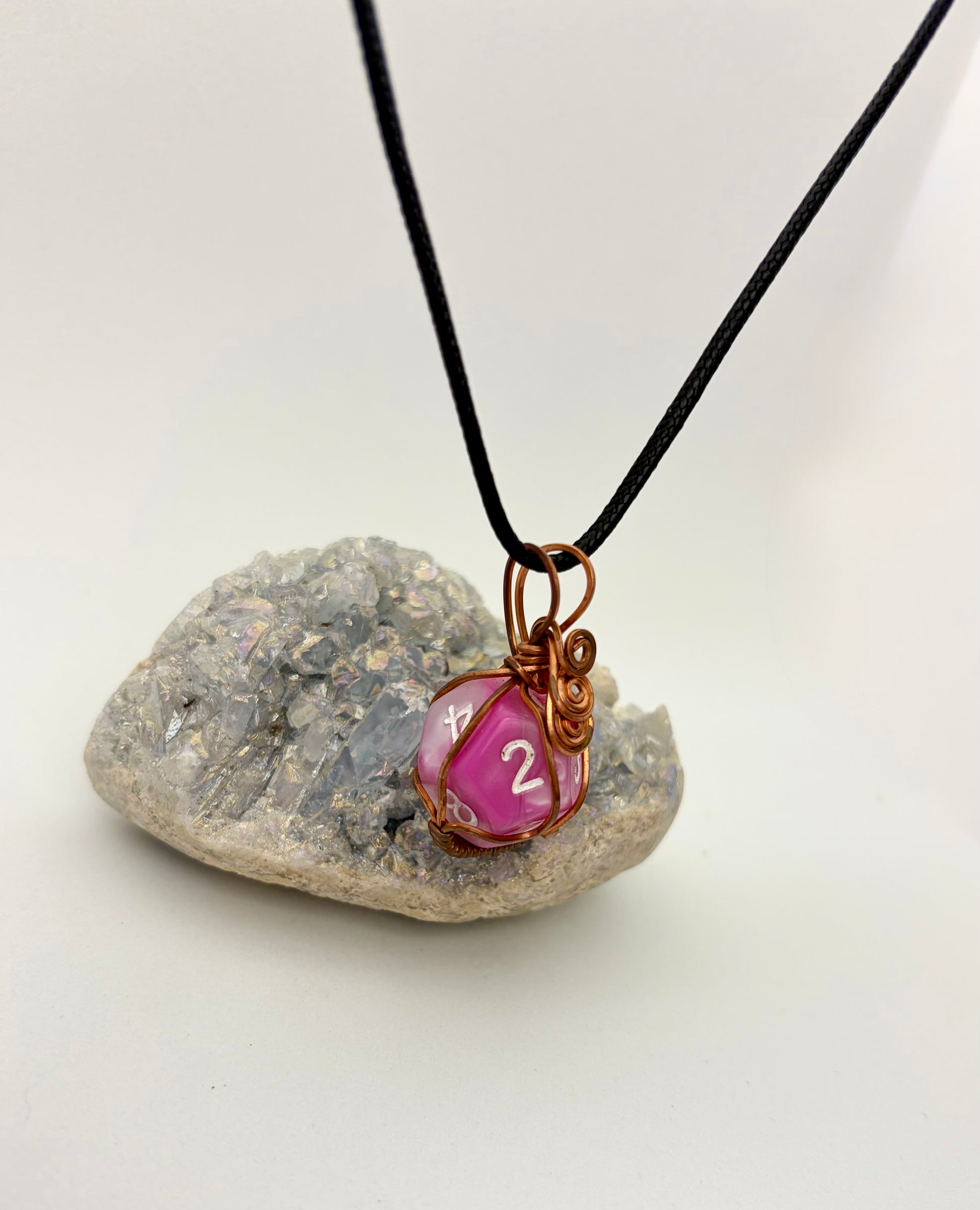 Roll for style! This Pink D12 Dice Pendant is wrapped in darkened copper wire with a swirl accent that gives it a handmade, magical vibe.