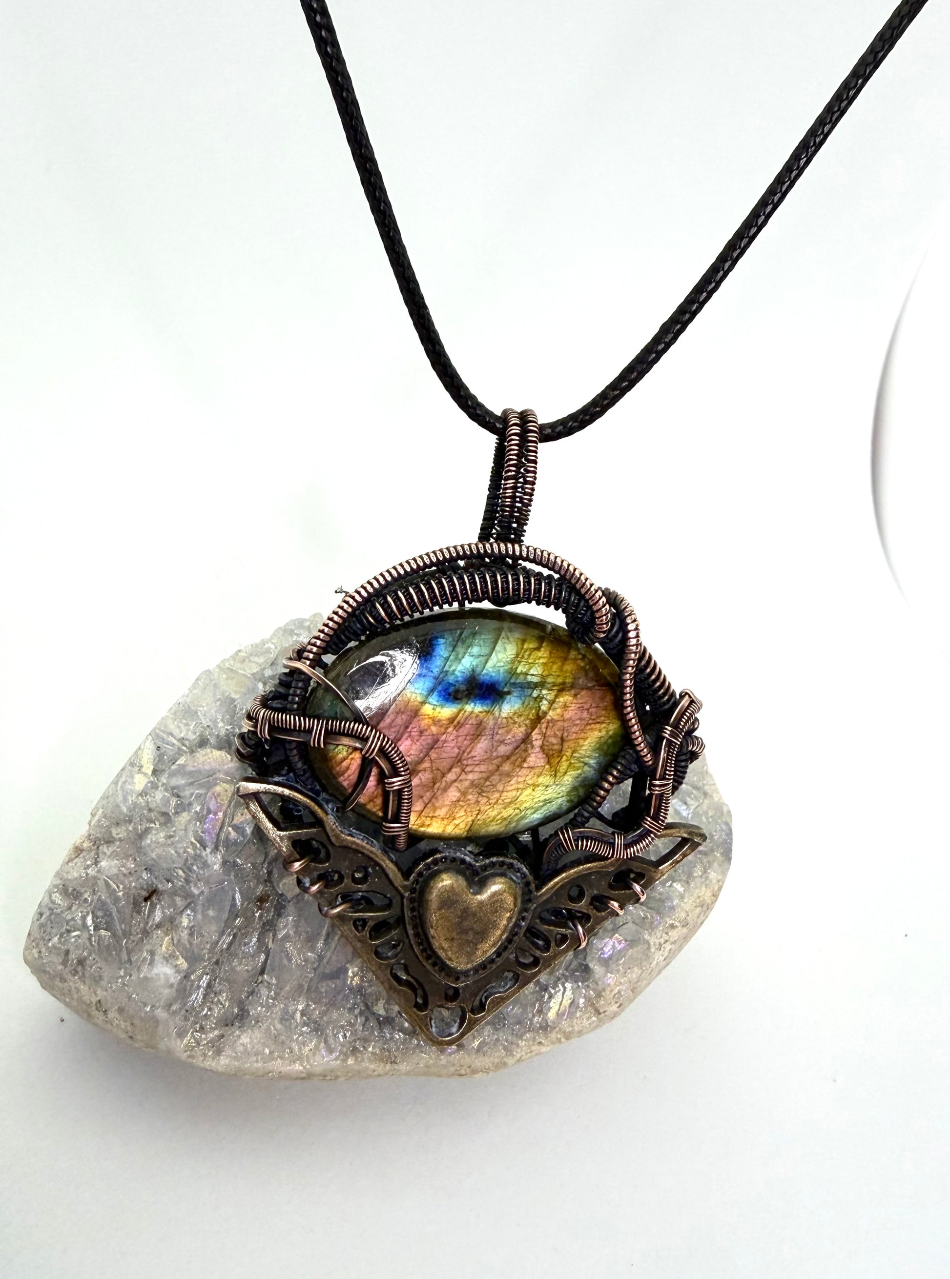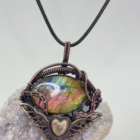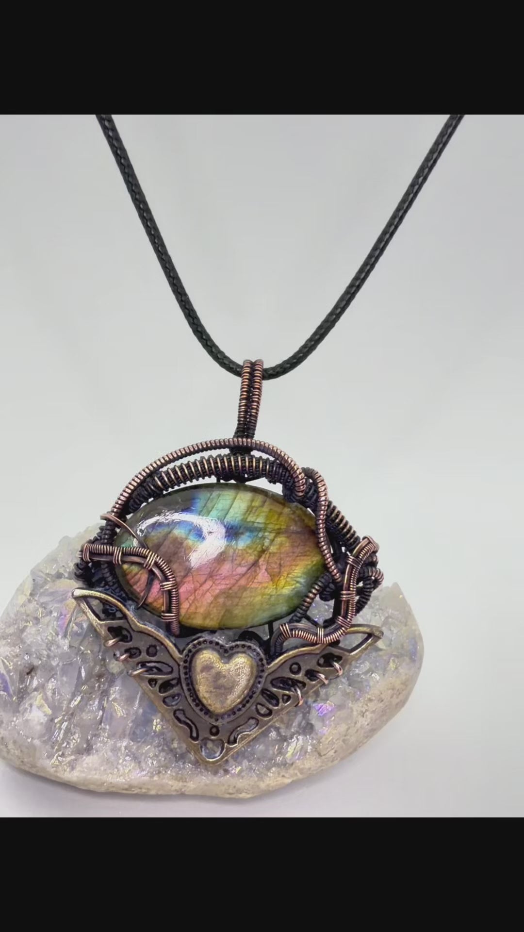 The genuine labradorite gemstone flashes gold, blue, and pink as it catches the light, framed by intricately woven copper wire and a bronze heart filigree base.