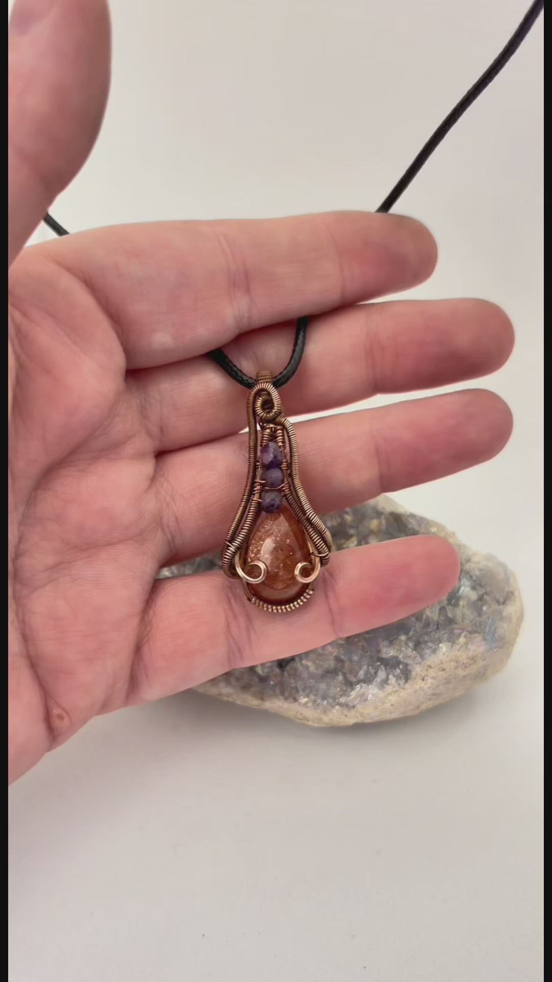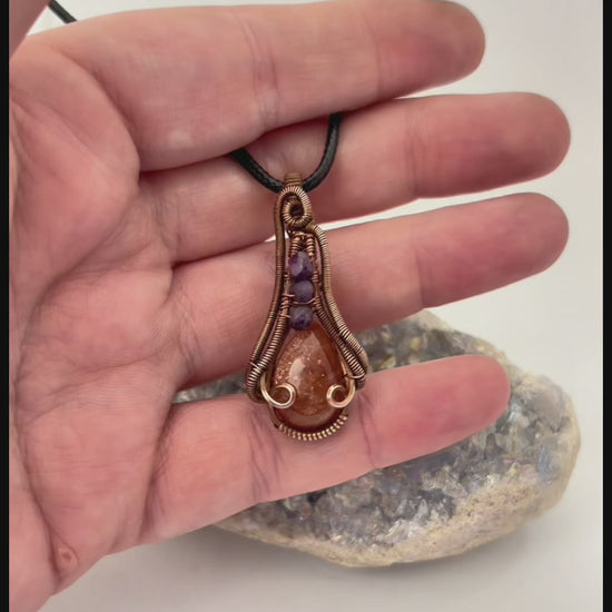Sunbeam & Starlight – Copper Wire Wrapped Goldstone + Amethyst Pendant