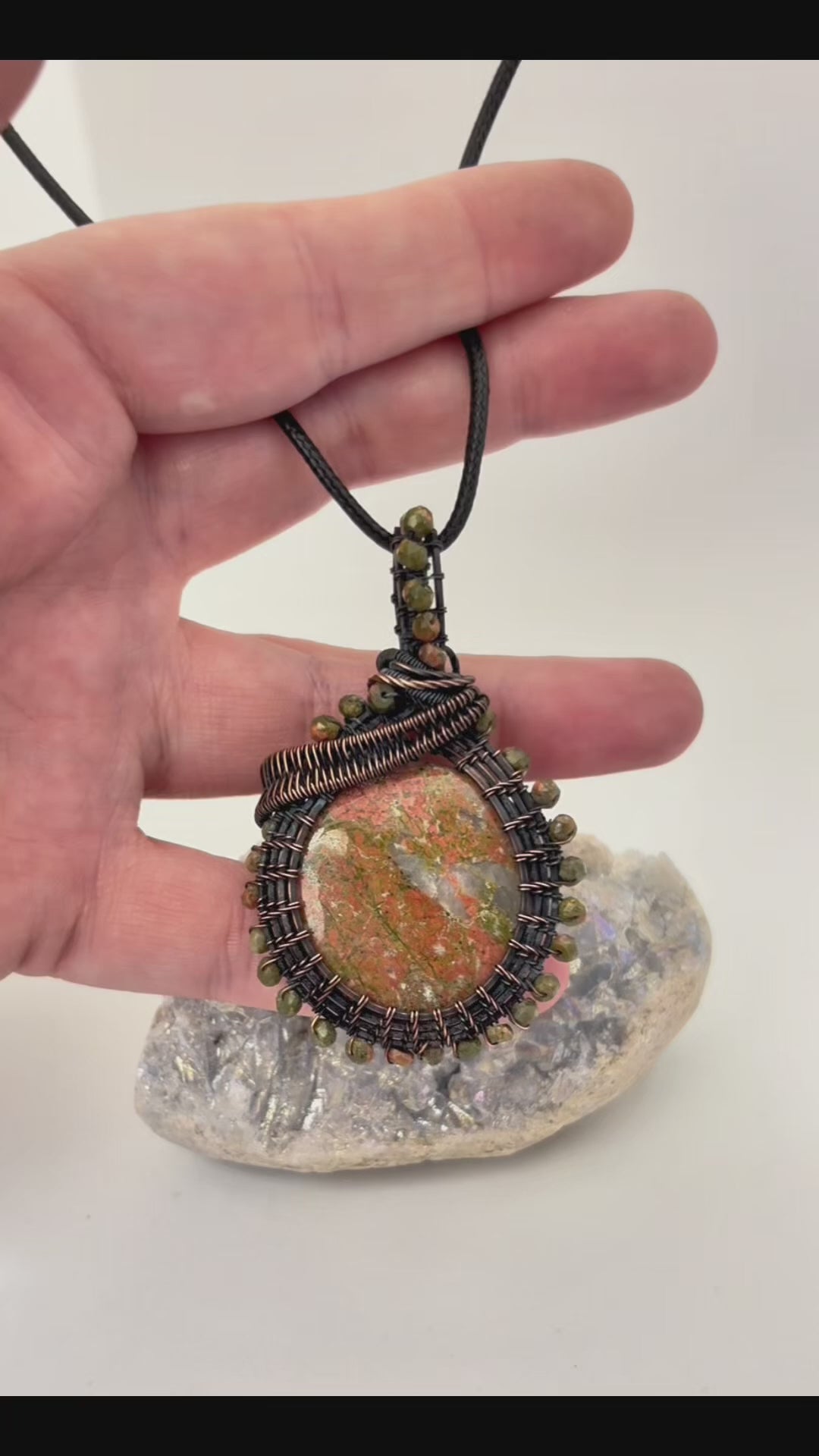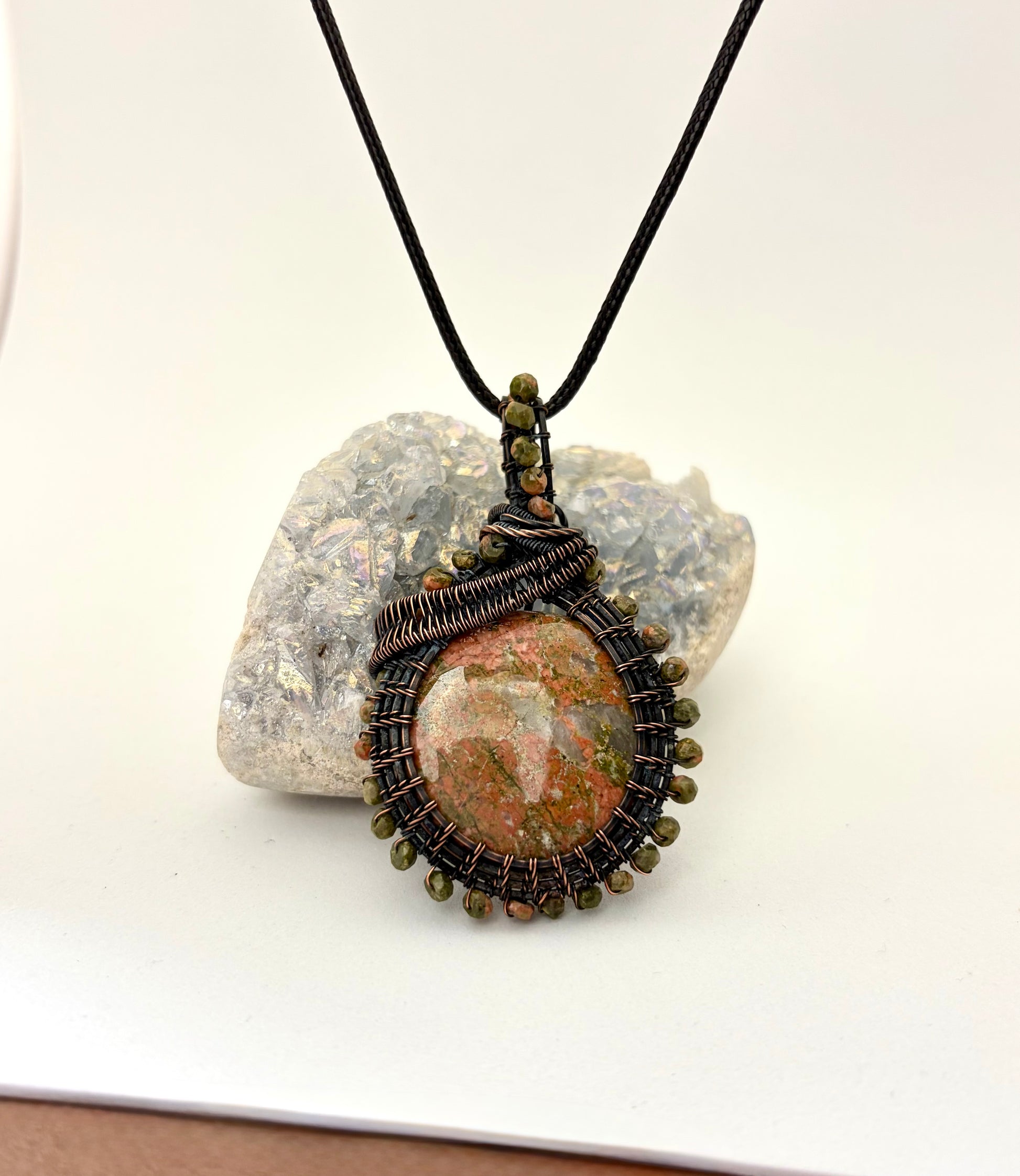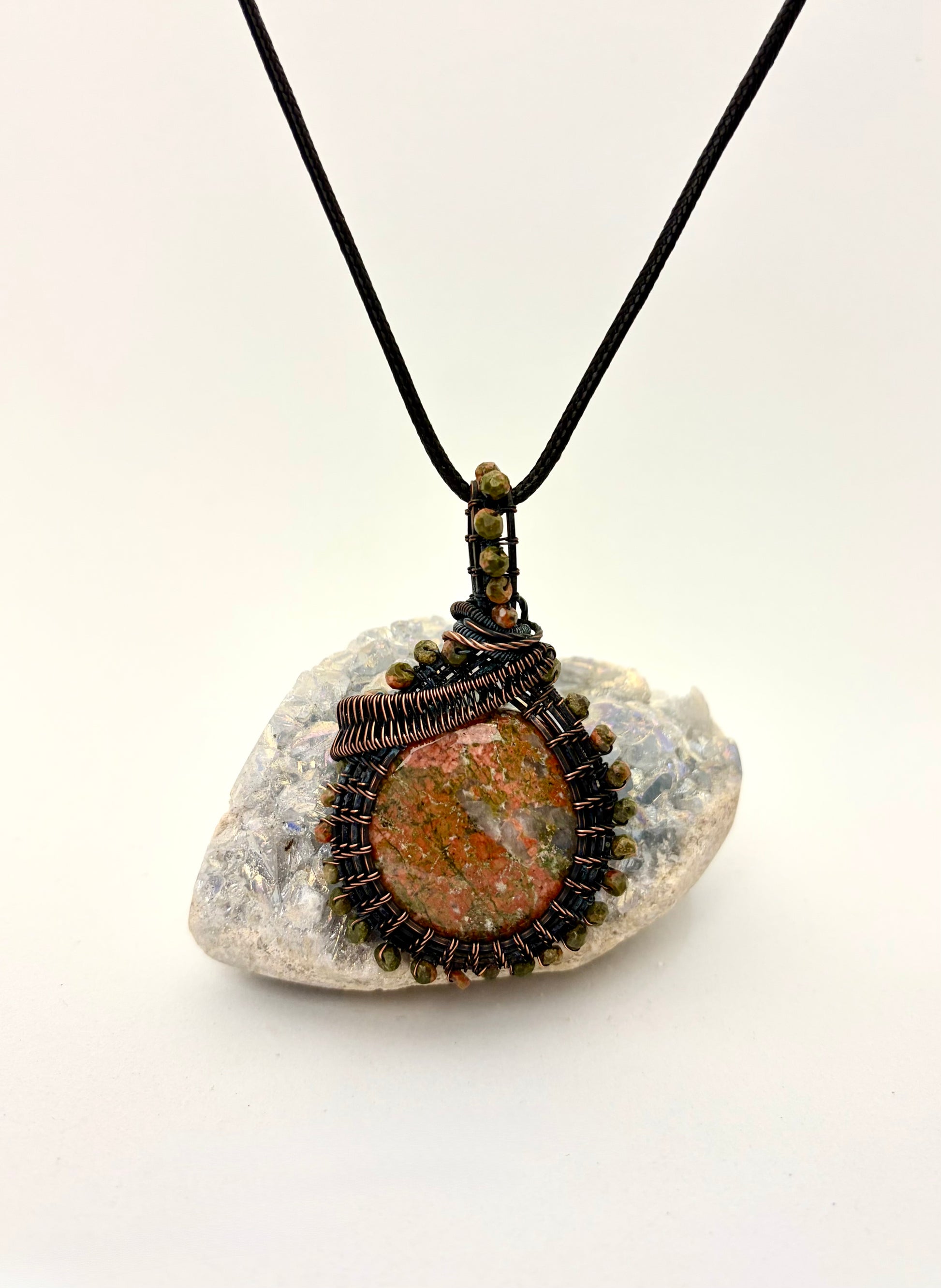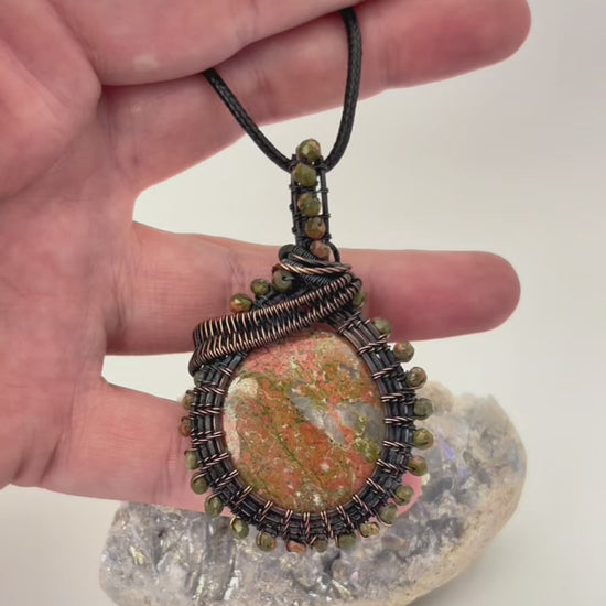 Unakite Jasper Wire Wrapped Pendant | Copper & Beaded Handmade Necklace